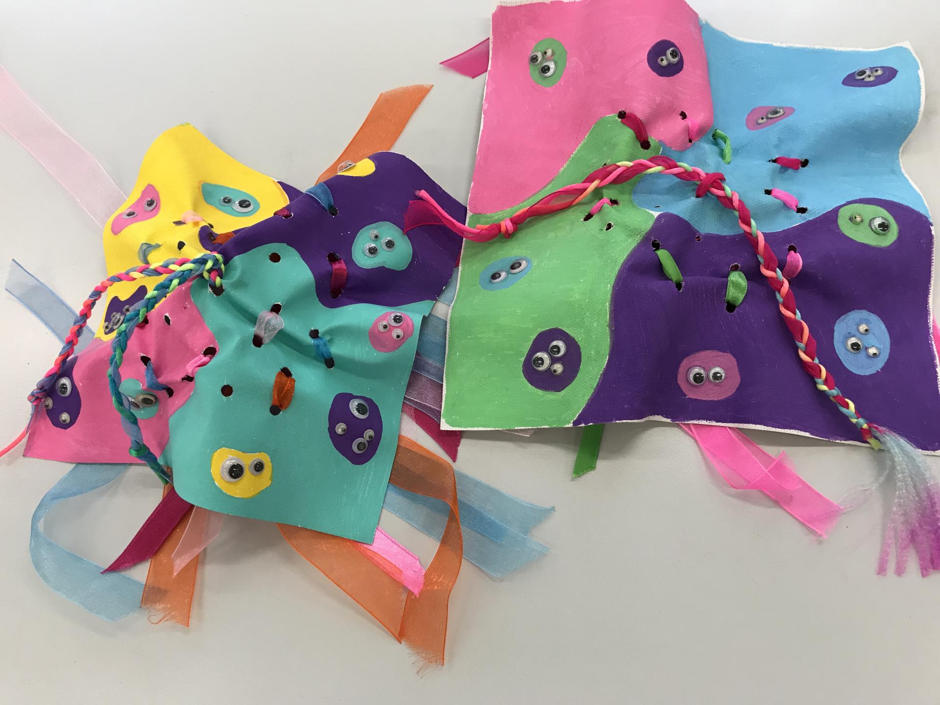 1000 Eyes Jelly Fish: Participants will create a tactile hanging mobile built of colourful canvases and 1000 googly eyes with braided ribbons.