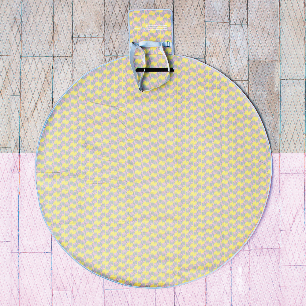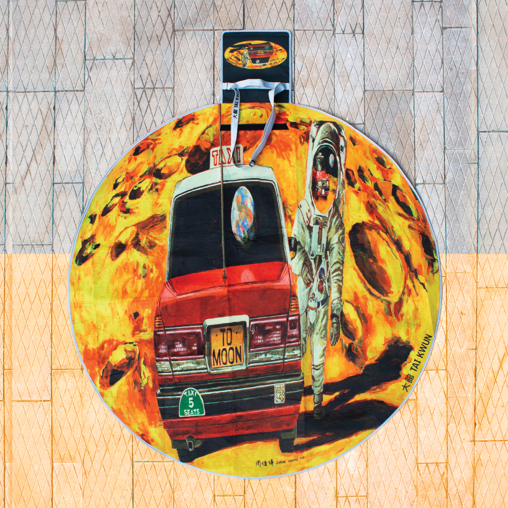 郊遊地墊以毛毯面料、防水隔熱底料製作,張開後直徑闊達1.5米可容納4–5人,亦可收納為輕巧卷狀加上揹帶便於攜帶,配合四位藝術家的靈巧創意,習實用性與藝術感於一身。